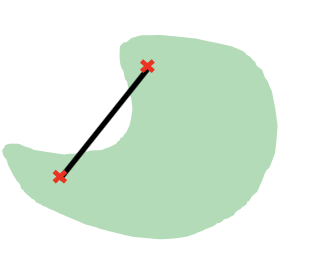 A convex set is defined as follows: if two points, x and y, lie within the set, then all points on the straight line between x and y also lie within the set, like so: