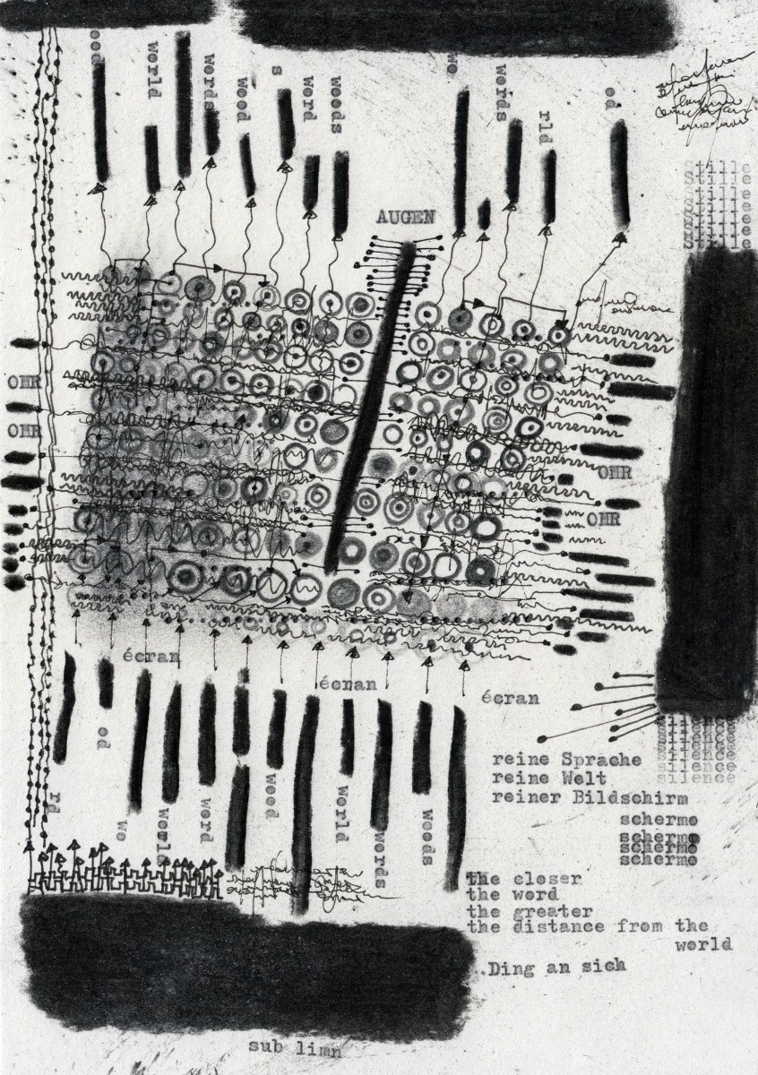 Another work that reflects an analogous connection to the field of biophysics is “Ding an Sich,” which is from the Transcript from Demagnetized Tapes catalogue. The body of the text is here addressed as a neural-semiotic network composed of cells, synapses, and various receptors or attractors. Sensory organs—suggested by the matrix of terms “Augen, Ohr–Ohr, écran,” or “eyes, ears, and skin”—function as interfaces that attempt to gather stimuli from the “Ding an Sich” substrate. Similarly, the artificial fuzzy and neural networks designed on the same page suggest adaptive mathematical models shaping their internal states in response to alleged incoming data.In biological systems, the initial configuration of a cognitive or perceptual device is continually reshaped by the flux of language and information. However, the pace of learning often lags behind the fluidity of perception. A word can thus be seen as a collection of alphabetic shells, representing unstable states subject to fluctuation. It is always ahead of its fully internalized signification. The transformation from “world to wor[]d” illustrates this fragmentation, where letters, much like charged particles, interact through processes akin to electrostatic charging and discharging.